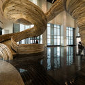 楼梯的结构由两个互相紧扣的部分组成:金属骨架与雕塑化的木材围护结构。两部分共同形成了从接待前台升起的回转形体——一直延伸到14米以上的第一层。Gelfand采取了一套连续木截面轮廓系统,看似活动而可以弯曲,实际上非常稳固。Gelfand一开始先用MRI型扫描运用在骨架上,竖向切割结构从而形成带有厚度的截面轮廓。这种方法生成了数量很大的截面轮廓。为了降低其数量,Gelfand将其限制为“主要截面”——通过计算木截面的平均抗弯刚度,控制“主要截面”的半径和角度。