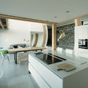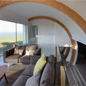 完成的住宅创造出一个旅程,从参观者来到这里的那一刻起,它缓缓展开,引导人们穿过不同的场景。从低处的西面山墙走近建筑,平屋顶与视平线处在同一高度,两边的建筑勾勒出从开满的鲜花到草地再到远处的大海的视野,这一视野和小径带着你走到一个人体尺度的前门。打开门,一面16米长的又未经粉刷的石墙吸引你的视线来到房屋深处,这道500mm厚的石墙部分使用场地上原始的石材重建,采用了传统的石匠工艺,不使用混凝土。这面墙是这栋住宅的试金石;从大部分房间都可以看到它,它将现代住宅和场地的历史连接起来。随着人们走下由种满花的平屋顶和两边强烈的建筑形式创造出的走廊,墙逐渐放大。两个空间之间的紧张感建立起这座别墅的戏剧性,极具现代感的弯曲的墙体对抗石材元素的重量。这面石墙上尽可能少的开口,形成卧室的入口,也利用了外部空间。这座建筑有7个不同的平面,与外部起伏的场地完美融合。
