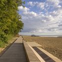 红木海滩开发项目在红木公园壮观的海滨地区整合了四个新的建筑,将他们融入了一个规整的海岸元素——一条457.2米(1500英尺)长的木板路。这条路一直延伸到断崖的底部,将每个末端的接入点都连接起来,让沿着密歇根河的东岸收获开放视野。项目的元素被安置在简单,小尺度和低矮的单位上, 沿着木板路排成一线,像是便亭和洋亭(休息亭)。建筑元素很长,低薄,在南北方向上主要是透明的。建筑小品的顶端也是选用的木栈道的材料,无论是向上看亭子顶端,亦或是从上面公园往下看海滩,这一切都很好地融合在一起。在北边,环境教育亭是一个大型开放空间,背面是一个瘦长的服务区域,提供公共卫生间和贮藏室。这个休息亭的南北面是用滑动玻璃门通向外面的平台,让他完全和木板路连接起来,并可以获得通过休息厅的良好视野。东部的墙壁使用的是没有竖条的玻璃,人们可以畅通无阻地欣赏湖泊的美景。