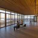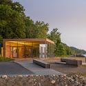 材料的选择是天然,简单,耐用,易于维护的“像海滨( beachy )”式:包裹建筑外立面的当地的石材采自威斯康星州南部,将其和背面的断崖自然栖息地融合在一起。 木质栈道平台选择重蚁木而西洋杉木包围了休息厅的外围和侧边。大量可操作的玻璃的将内部外部融合起来,得以欣赏河岸全景。该项目的窗玻璃选用人眼不可见的微型陶瓷熔块,但鸟类可以观察到,以此将鸟类的撞击减少到最小。