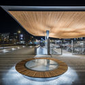 雕塑般的木屋顶上面覆盖了两层石板,就好像从轨道方向生长出来一样。简单的玻璃嵌板在这里被用作保护其他元素的附加物。即使是灯光设计也影响了该项目,因为自行车支架的屋顶主要的光源是间接而隐藏的。两个现有的应急楼梯也被拆掉了,并换成了一个环形的进光空间,光由此打在了平台上,照亮了一层的长椅。