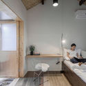 室内的家具配饰单纯的满足了一间B&B的基本需求:固定的的双人炕带有几个大抽屉,可以储藏额外的被褥和客人的行李衣物;悬挑的软木桌板为住客提供了一个工作的区域;经典的 Achille Castiglioni 吊灯同时为工作台和和床头提供柔和的照明。