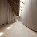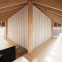 生活空间围绕在中央的一个正方形储藏室周围。位于二楼中央的是客房。它还可以作为茶室,客房,或是阅读室等空间来使用,围绕在客房周围浮在水面上的是“灯光阳台”,其光线来自于安装在上面四边的照明设施,柔和的光线照射在透明的纱幔上面形成了一个光池。“阳台”光线从顶部灯光的四周弥漫在床单上半透明的布料并创建一个池的光。它能够随着微风的摇动创建出一个光波动的景象。