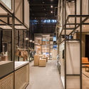 三座‘弄屋’的结构由模块化的金属框及活动单元组合而成,便于店铺换址时拆卸重装。 单元的设计取材于‘里弄’中丰富的元素:入口单元可看到经典的‘石库门’弯角;上 海市井标志性的外伸晾衣架化身成服装展示架;旧式凉椅的竹编被用作单元的分隔;可 移动的定制家具在‘弄’内提供灵活的商品展示,由黄铜和木材做成,让人联想起弄里 的长椅桌凳。