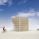沙漠里金色的立方体吸引人们进到这里,人们也好像成为装置了这个现代语言的格子装置的一部分,这座建筑采用了传统火祭节的卡纸与塑模。