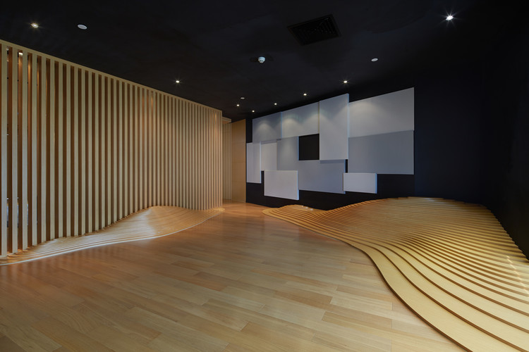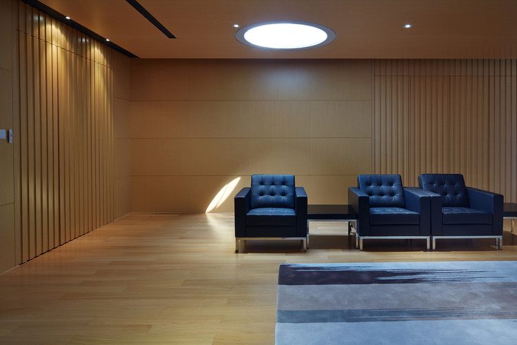 VIP接待室的设计沿承了枯山水的感觉,地面像山势一样缓缓变化,与仿佛森林般竖向的格栅制造了阴影与房间之中的柔软流动。