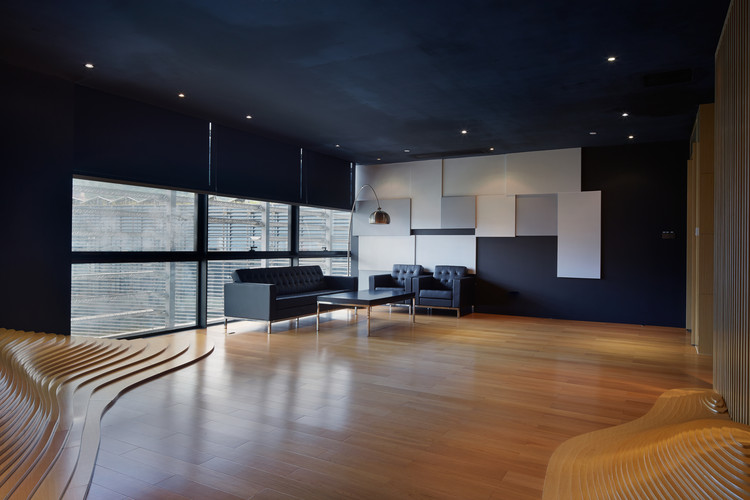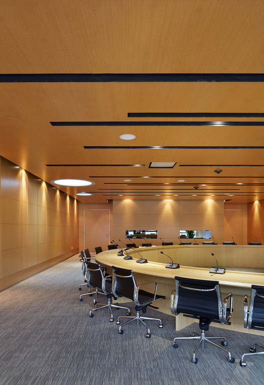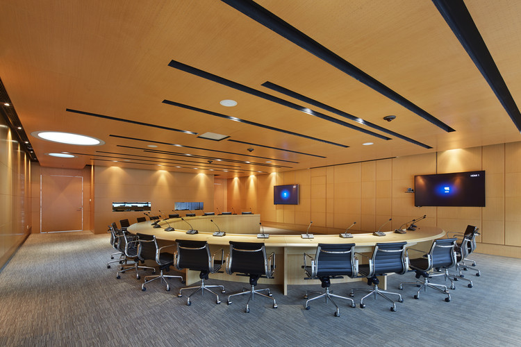 木材质和深灰的地毯既吸音降噪,同时又隔热保温,从而创造了会议室相对独立的空间环境,并为室内带入了与冷酷的建筑外壳不同的柔软而温暖的质感。
