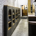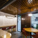 为了创造竖向联系和体量感,我们掏空了建筑的前半部分以连接平台和屋顶的椽。不论你坐在什么位置,朝向何处,你都能见到建筑的框架,听到周边的种种活动声音,并且闻到碳烤食物的味道。我们不仅仅挖空了建筑,还剥落了建筑的装饰,使得方形体量中原有的砖墙和屋顶的椽得以展现。通过暴露老建筑的这些部分,我们希望揭示它原有的材质和形态。在拆除二层天花板后,我们发现天花板到屋顶的区域没有墙分隔,仅仅依靠其他建筑来遮挡屋顶空间。一旦发现墙体和屋顶如此脆弱,工人们便着手修复他们以避免更大的损毁。从木炭架引出的通风管道成为了竖向空间的元素。