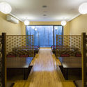 典型的日本餐厅中,用餐者需要经过一条狭窄但简洁的通道才能进入用餐区域,这个过程中他们还会收到热情的欢迎。不仅仅室外街道空间和室内空间被隔绝开,内部空间也被划分成许多小部分:通道的尽端是私人房间;用餐空间则被屏风隔开;厨房也由狭长的柜台分割出来。为了空间的对比,我们尝试在入口空间尽可能增加与街道的联系,其中做法包括在沿街立面提供座位以及增加玻璃的使用(使得入口更加透明)。当人们走上入口的台阶,走近主入口的滑门,他们可以清晰的看见楼上临街的顾客正在享受美食。原本两层的建筑中我们在用餐区域添加了隔层,以尽量增加入口处的活动空间,并且与底层厨房产生联系。