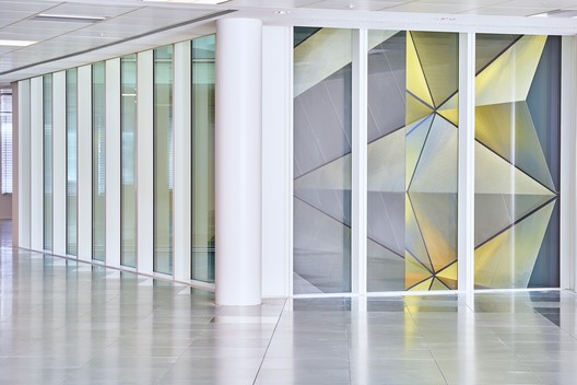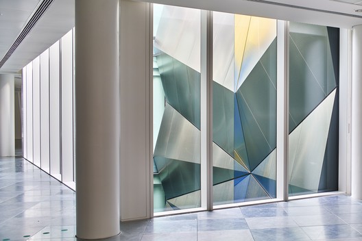 位于接待处东侧的弯曲石墙上的一个胡桃木覆盖的休息室设有一个时尚的接待台,并可欣赏到灯塔下部的景色。 灯塔通过建筑物带来日光,并在地板之间提供可见的连接。 受到该项目委托的Carpenter Lowings设计的艺术装置在整个灯塔中时刻运行车。 动态的铁片由不锈钢面板折叠组成,反映出WilkinsonEyre所做的研究开发,寻找一种能将将反射光引入建筑物深部的装置。