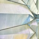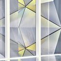 ’Folded Light’ – which has been designed specifically for a slender void space in the building measuring approximately 9 metres by 4.5 metres – serves as a strong visual connection between the lower ground floor and roof. Manufactured from pattern-rolled stainless steel, ’Folded Light’, is an asymmetrical arrangement of mostly triangular, three-dimensional folded panels of varying sizes and different folding angles. Together, these create a single continuous rippled surface that appears more compacted toward the bottom as if compressed by the weight of the form above. The angles of the folds are intended to enhance the drama in the existing light conditions by catching natural light from above and contrasting it with shadow below. The entire wall is split by a vertical blade of dichroic glass which separates the spectrum of light into two, complementary sections. This results in a contrasting range of colours when viewed from either side of the void space.