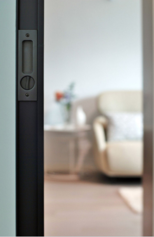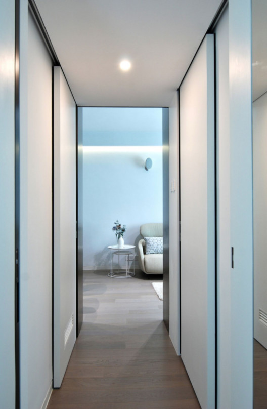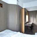 通往卫浴及卧室的走廊由三扇白色的推拉门所界定,黑钢把手设计增添优雅的细节。卫浴的墙面及地板采用大块石纹磁砖。隐藏的层架为淋浴间提供收纳空间。儿子卧房在卫浴对面,简单的布局创造出舒适实用的房间。主卧由两间卧室结合成为相连的卧室与衣帽间,通过弧形木饰面与圆角的运用,塑造令人放松的空间。铜色金属用于床上的展示框、门把以及衣帽间的窗框,使窗外风景成为设计的一部分。