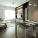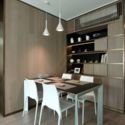 厨房位于入口旁,透过重新布局并采用薄隔间,增加了可用面积。白色亮光漆、深灰色玻璃、橄榄色磁砖以及米白色石英石的材料组合,带出具都市感的效果。