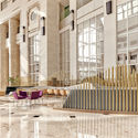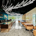 进入室内空间,我们选用了具有神秘隐匿色彩的主题色—孔雀蓝,细节处采用了更多精致的实木及大理石材质。作为“山水”的延续,近千个大小不一的白色亚克力和镜面不锈钢片垂吊在空间顶部,借助粒子流体动力学模拟溪水的动态,不同的材质,或发光,或反射,犹如缓缓流动的溪水在阳光下的粼粼波光。这股溪流从大堂入口开始,流经层叠变幻的山峦,流向空间中最繁忙活跃的吧台上方,随后在整个咖啡馆散开,最终如水花般消散在室外的阳光平台。