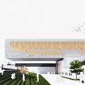 锯齿状的表皮将参观者引导到一个整合的三角形体量之中,这个方案整合了现有的 展览中心建筑,新的空间呈线性排列,保持一个大型的不分级空间。新建筑采用重复的木质梁柱模块,填充钢缆和PC材料,可以间接吸收太阳能。