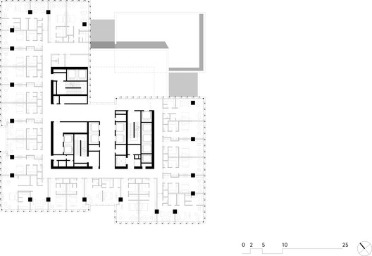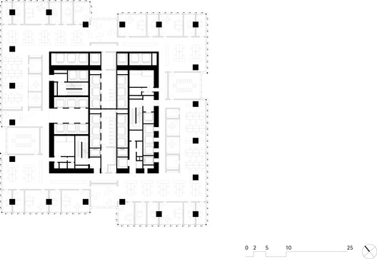 A total of 186,000 square meters of the highest tower is subdivided into five office units with nine stories each. Above this section, from levels 61 to 79, 58,000 square meters are dedicated to a five-star hotel with 250 rooms, amongst other functions. In addition, the top of the building includes exclusive meeting rooms, bars and first-class restaurants. In the entrance lobby of the base structure there will also be retail facilities and a foyer for two function rooms which are part of the hotel.