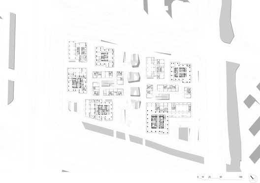 The spaces between the buildings are used for narrow streets and squares. Glazed facades create a pedestrian-friendly atmosphere, and provide space for shopping facilities. Overall, the new financial center provides the entire quarter with its own identity.