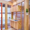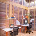 移动工作单元所在的大楼是1920年建成的一层无筋砌体车库。它是粗野并且给人无数遐想的空间;当人们进入空间时,他们能感受环境无限的感染力。当你谈论想法或画草图时,也怀有一样的心情——设计仍然没有好的解决办法,是粗犷的,但是却透露着纯净的希望。LOS OSOS 希望在空间中保留它,同时仍然使用它。办公空间需要改进:控制小气候,进行漂亮的装饰,划分不同用途的隔断。我们不想以典型的方式“改造”建筑物;我们的解决方式是将其作为办公室使用,但在某种程度上保持其启发性的本质。我们选择了盒中盒的方法——让更大的空间传达 Coroflot 和创意潜力之间的积极关联,更小的空间表达了对细节和质量制作的共同设计价值观。将这些东西集中在一个小的空间也能有较经济的预算。这个解决方式也需要对针对 Coroflot 的编程过程起作用。他们是一个小团队,所以沟通和协作是空间需要满足的非常重要的功能。平面图将重点放在中心的活动节点上,同时表面材料允许光线和视线通过,确保没有如影随形的个人约束感。