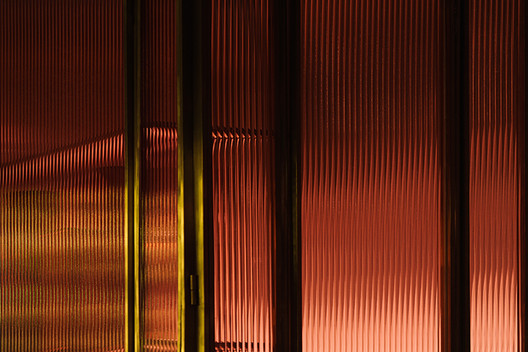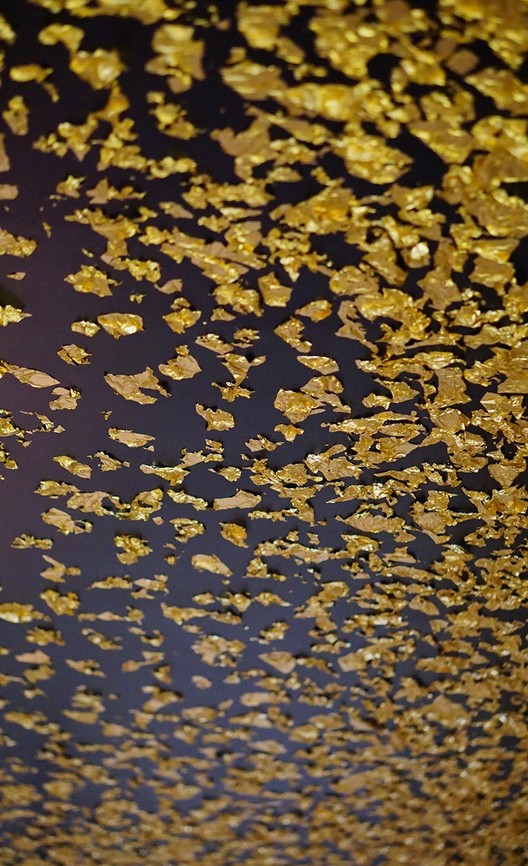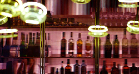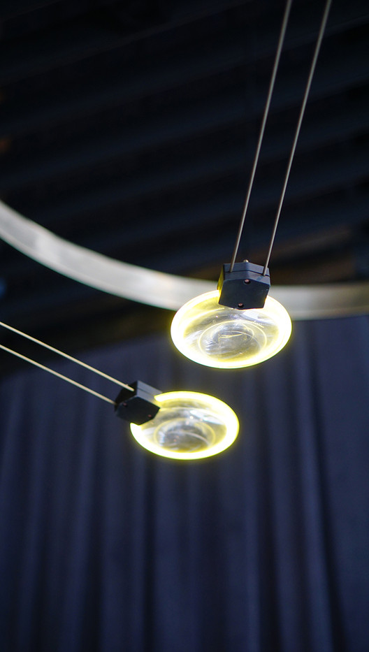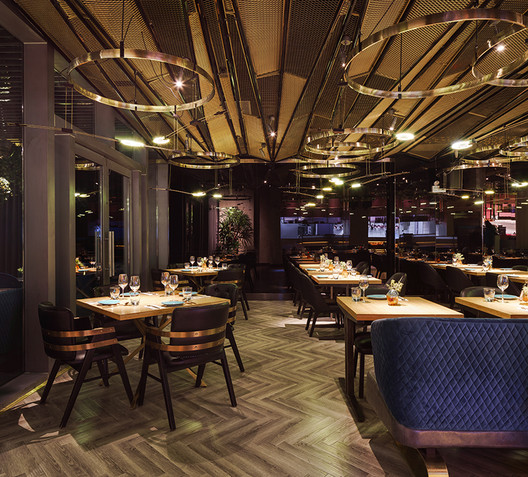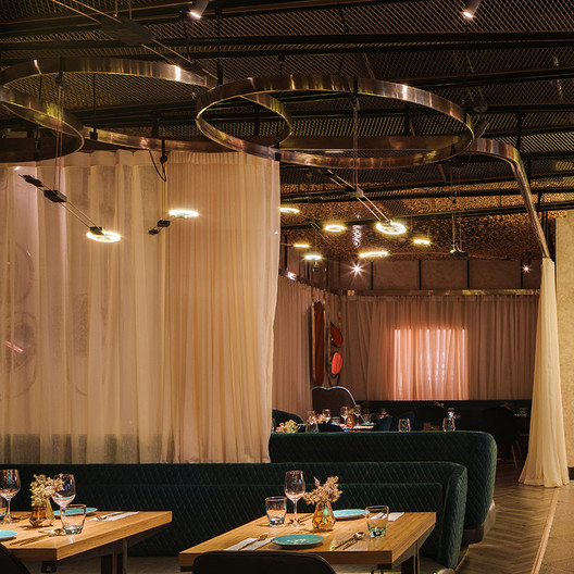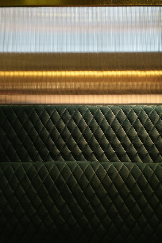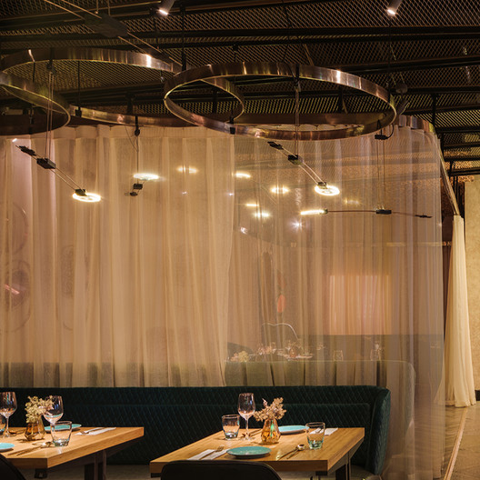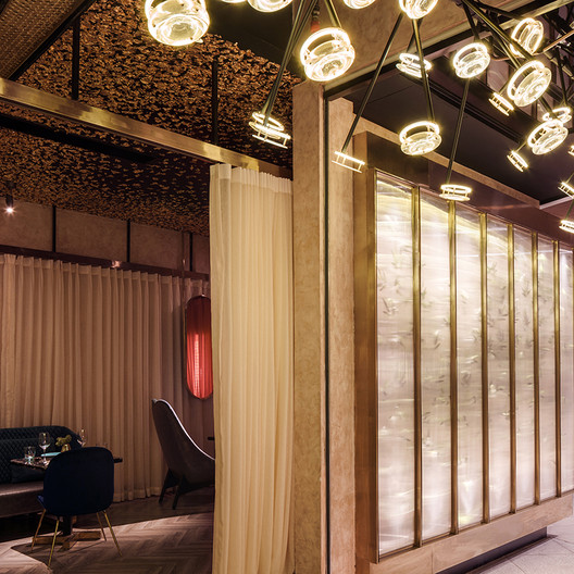 同时,主用餐空间散布着定制的照明装置,订制的 COB LED 吊环灯,通过一个有纹理的折叠天花板增加深度和层次感,配合黄铜材质的基调,提供了一个温暖舒适的用餐环境。