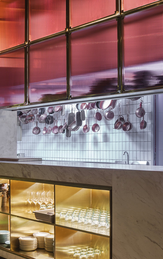 大胆的开放式厨房位于餐厅中间,它的布局有利于餐厅服务人员从厨房到就餐区的流动。亮粉色黄铜和大理石吧台体现了 VIDA 的核心。
