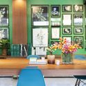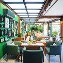 其次,设计师十分注重材料的选择和风格的营造,避免像其余相似的时髦办公室们一样使用现代元素,风格和空间设计,力求做的像是个很温暖的家。因为该品牌“Wangprom”在泰语里由2个字“Wang”和“Prom”构成,“Wang”指宫殿而“Prom”指梵天神。因此,由80世纪当地宫殿启发,现有的柱和梁被包上了暗木贴面,另一方面,明亮的深绿色作为公司的颜色已被用作墙壁和一些家具的配色方案。挂在深绿色的墙壁上的几个手绘草药图,传达了品牌形象。此外,另一个有意义的元素是许多草本植物的插图定制壁纸,“Wangprom”产品的主要成分被放置在包括厨房和洗手间的每一个角落。以及该办公室旁边生产线的香味,使品牌形象与空间相得益彰。