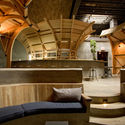 从设定的昏暗门厅进入成角度布置的酒吧/活动空间,在其尽头显露出设置在走廊尽头的圆顶室内空间。在进入时,酒吧结构体是视觉焦点,也是地壳的反衬物。酒吧结构的桁架支撑着酒瓶和界定空间的顶篷。在尺度和半径上略有不同的两个地壳,形成了高度有所不同的半封闭私密座位区;其中一个座位区被略微抬高,而其他座位区则处于类似于乔治尼尔森(George Nelson)时代的“谈心角”楼层里。在空间后方的地壳,是与内含小舞台、DJ台和空间照明的后部活动空间相连而谨慎设置的门洞。