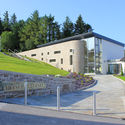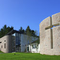 新的中心被放置在教堂占地范围内的边缘地带并有意地作为教堂花园的背景幕布。在这样一个敏感的场地上,(满足)一个大型的多功能大厅的需求产生了特定的挑战与机遇。整座建筑嵌入开凿过的山丘。大厅是一个两层楼高的空间,并且在较低的水平线上可由从教堂而来的供宗教游行用的人行道进入。人们同样可以从较高的停车场,沿着花岗岩承重壁下降进入主要的空间。会议室和厨房作为附属空间在尺度上则更为亲昵。
