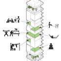 第二个方案垂直村落(Vertical Village)被誉为是为了解决香港的房地产危机而重新制定典型的本土建筑模式。该方案使用了当地传统山墙,为每个模块提供了不同的分区处理,提供了动态的、丰富的空间多样性,同时帮助形成一个相互连接的垂直村庄。