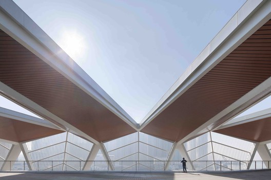 建筑造型的灵感,来源于帆船之都的“帆”和青岛历史建筑连绵的“坡屋顶”。为了体现力学之美,室外立面钢结构外露,省去幕墙表皮,结构形式本身成为了最有力的立面语言;室内空间在吊顶的设计上也尽量不遮挡主结构,让人们在室内依然能够阅读结构的逻辑和感受力学之美。