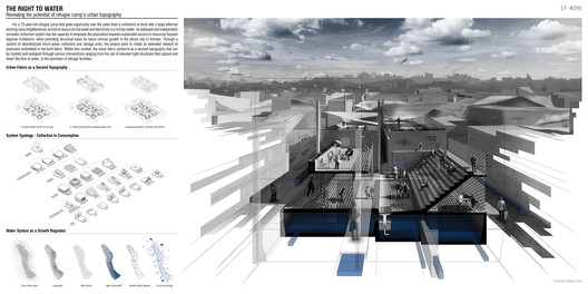 该项目着眼于巴勒斯坦境内的难民营,题为“水的权利”,利用难民营的随机性和极高的居住密度,创造了一个充足独立的雨水收集系统,该系统能够赋予居民持续充足的水资源而不受区域限制。该系统的第一阶段分为三个步骤,可以由居民(DIY)独立实施完成。这三个步骤分别是:安装单独的导流板和水箱,建造共享的水箱,以及将共用水箱与沟槽和输水管道连接。后期阶段还包括城市层面(Amman水务局),DPA(约旦巴勒斯坦事务部)和UNRWA(联合国救济和工程处),来共同建造主要的地下储水罐以及用于集中分配蓄水的建筑物。这种模式不仅在实施方面有极高的独立性和灵活性,还将为年轻一代留下关于难民营的记忆。