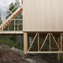 为了避免过度开发四周的森林,该住宅采用木材框架将其从地面上支起。这个建构贯穿了整个住宅,一直延伸到了顶部的阁楼。