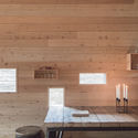 就像柯布西耶的朗香教堂一样,这座小屋的窗户排列随意,大小和朝向都各不相同。但是它们也会在保证小屋的与世隔绝般的隐逸感和安全的同时,慎重地引入适量的自然光线和景观。坐在桌子的尽头,透过窗户映入眼帘的各种景观都是一处独特的风景;Gairn 河的转弯处、长满草的冲积平原、被 Allt Bad a’Mhonaich 的河水破坏了的Ben Avon,高原顶上巨大的花岗岩石,都能尽收眼底。小屋的室外和室内都以木材作为贴面,与下垂的曲木框架屋顶的飞檐、被苔藓和石头覆盖着的屋顶共同组成了一番原生态的景象。