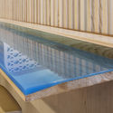 良辰餐厅的空间被不同体块和其相对应的材质所区分。材料丰富如下:“X”形或是格子状的混凝土砌块(CMU)、木板条、瓷砖以及石膏板。冷调的蓝色、暖调的白色加上柑橘黄的视觉冲击,不同的表面和其多样的材质就被分隔开了。
