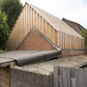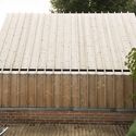 经过商议,大家决定保留棚屋原有四面墙中的三面。在这些限制因素下,一个新的木质体量搭建了起来。半石砌的建筑被保留,它展现着新老建筑之间的联系。木质的板片和板条为这个简单的体量增添了立面上凹凸不平的深度变化和韵律感。