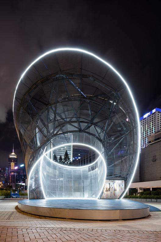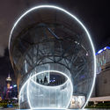 ‘乐。游’展区开放时间仅得四个月,故此团队选择了用铅水网为外层物料,营造通透通风的效果。游客亦更能体会悬臂结构的动态。灯光效果更是设计重要一环,利用四条灯带勾划出建筑持续扭曲的轮廓,并有序地回圈和作渐变光度的变化,充分显示了建筑独有型态和动感。