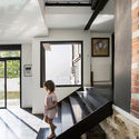 为了让人们享受这个过渡空间,营造正如在两个建筑时代中穿梭的氛围,原住宅的一层被改造成开敞性空间,并填充了大量的家具。这个空间也是家庭中两代人的沟通场所: 扩展空间内的孩子们, 原住宅内的成人, 在两个建筑体之间的过渡空间中心相遇。