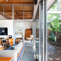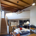 位于上层的卧室,卫生间和书房的设计有意结合了旁边树木茂盛的景象,同时楼下的卧室和卫生间的设计也映射了主人心中逐渐苍老的感悟。居住区的天花板被挑高,空间也向北方打开,利用了十字通风,吸收热量的墙体和避免阳光直射的设备来制造最佳的室内温度体验。