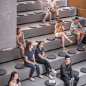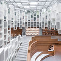 镜像楼梯引导来访者至规划了阅读区和座位区的夹层,再延伸至B2。两层空间之间另设有四个楼梯,加强了空间的垂直联系。整体空间沿墙壁嵌入落地书架,如缎带般在空间中延续。与落地书架向对应的是受到米开朗基罗·皮斯特莱托在六十年代创作的“迷宫游乐场”作品启发的透视书架。