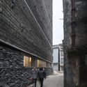 在材料的运用上建筑师同样希望体现上述时间的厚度和可游历,几乎所有的建造材料均来自地方,建筑是以一种奇异的方式将这些粗犷的新旧物料组合成新的时空叙事和场所体验。连续屋面延展至外墙面的材料由附近城乡旧屋所回收来的灰瓦和当地称为西岸石的黑色片岩混合砌筑而成。这种于老城匹配的深灰色调有屋面、墙身延续至建筑的基座与地坪。整个博物馆的架空首层地面和建筑墙身依然以西岸石片铺砌,与新旧建筑之间间的U形绿化庭园相映成趣。所有新建展厅外墙采用传统的白铁皮(镀锌钢板)与旧灰砖墙体片段的组合,混凝土与黑色钢板组合的连廊穿越其中。在博物馆原址已拆除的果品仓库里曾经举办过十一届摄影节,是许多人共有的回忆,果品仓的木制格子窗户有着那个年代特有的气息,建筑师有意将其回收,重新镶嵌在博物馆新建的连续屋面及其外墙面上,新旧交融宛若一幅意味深长的抽象画。
