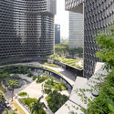 这个项目由两个富有表现力的雕塑塔组成,它们被动态雕刻成一系列圆形的城市空间。曲线的外立面带有精致的蜂巢形肌理遮阳系统。建筑纤细的外形包裹着公共空间,同时由此产生的几何图形补充了现有建筑的角度,并创造了一个贯穿户外花园、人行道、咖啡馆和餐馆的景观。