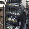 建筑外立面向内退,形成立体交错的露台空间向外悬挑。不同层的露台的尺寸与外形都有所不同,随着楼层上升这种层叠变化就更加丰富。此外,整栋大楼的立面都是落地玻璃,从餐厅内部可以轻松眺望城市景观。这种形式将餐厅空间延伸到户外,对于毗邻该楼的街道来说,也是一道生动的风景。