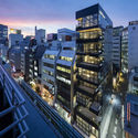 这栋专门为餐饮业提供出租空间的大楼,位于东京的中心街区,周围都是中低层的办公楼建筑,该地块形状又长又窄,三面临街。