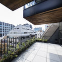 建筑师在上下露台连贯衔接的地方都有意地留了一处空隙,这样即使是坐在较高楼层的食客也能感受到楼下的车水马龙,不会错过东京都市充满活力的氛围。在典型的餐饮大楼设计中,不同餐厅一般是完全相互独立的,然而,在这栋楼中,交错的露台空间将不同餐厅关联一起,食客可以随意来往。