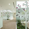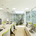 ATM和出纳员窗口位于一楼,在这层还有3个庭院以及一个带有14种不同颜色椅子的开放式空间。二楼则有着贷款区域、接待区域、办公室以及4个庭院,而三楼则是为了工作人员预留的设施空间,其中包括零钱室和咖啡厅。7个被自然光线充满的庭院则中满了花草树木,他们之间则有着些许距离。白色墙面和玻璃窗口上则有着一系列叶子,他们有着24种不同色彩,以此来呼应庭院中自然树叶的形态,以此创造出置身于魔幻森林中的感觉。
