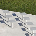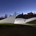 定义空间的第一步是确定空地中心的三角形广场。铺砌的地面与周围草地清晰的划分开,定义了未来的社交空间。然后,采用一条狭窄的通道,连接到经过的道路。 中间由这两种铺面的几何图形所组成的部分,被赋予了轻微的倾角,使活动空间免受周围环境的影响,并将使用者的视线引导向中心。接下来,礼堂的体量和大看台被抬高创造一个内向的乡村广场。最后一个步骤是用统一的平面来截断凸起的体量,从而形成一个虚拟屋顶的效果,并完成结构形式。