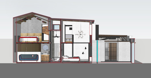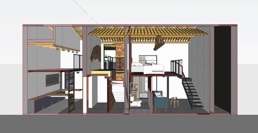 由于“糖房”独具一格的空间构成现状,既要保留院落的完整性,又要采用与传统线性平面布局不同的空间立体改造方式并营造出公共活动与居住、工作的混合业态空间。我们开始着手对这栋老房进行改造,「糖房」承载了设计事务所(工作空间)、民宿(居住空间)、图书馆和咖啡馆(公共活动空间)三种不同的功能,多种功能的叠加、融合、复合改善了人们的活动体验和消费感受。