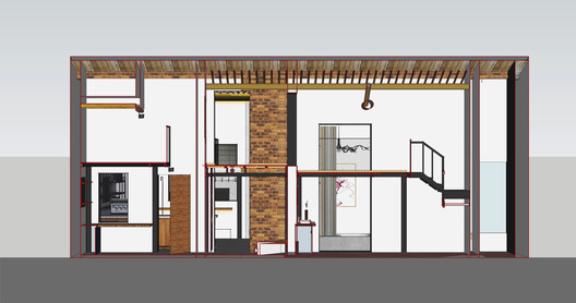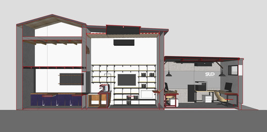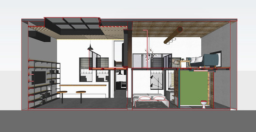 同时与居住和工作区域的子空间相连、互通,与室外的庭院环境相得益彰。这样的中厅空间既可以与前面工作区合并使用,也可以独立作为咖啡体验区,或者与后面居住区合并作活动区。人们可以在此举办沙龙和派对。连续路径在有限的区域内创造出更多的趣味性和体验性是 “糖房”独有的空间特征,活力与宁静兼而有之。