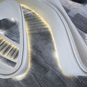 进入大堂,楼梯“围合曲线”的灵感来源于莫比乌斯环, 纯粹的空间被赋予强烈的艺术氛围。