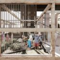 这正是系统性和可扩展性兼具的这一片线性排列的住宅的基础,垂直化的通道连接着居民和水面上通过桥梁和小船建立起来的集体化公共客运。在中心广场旁边的小建筑依然包含着各种尺度的开放空间,住宅小庭院里集体的晾衣线让人想起乡村建筑,建筑之间的小广场是社交生活的交集点,为家庭生活提供了舒适而熟悉的生活环境。在建筑的屋顶上,空气循环在住宅和在钢木混制的结构中进行的小商小贩之间,一个大型的自由广场存在相对与桥梁之间的空间中,仿佛住宅们的屋顶,广场结构中无穷无尽的线条就好像复杂的生活,或者一座成型中的城市,自由而富有活力,随着时节的变化而搏动着,这是一个呼吁,呼吁人们反思现状和并通过行动建设一个所有人都能平等生活的世界。