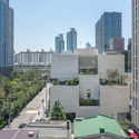建筑的宏观尺度凝聚在新生物体设计的空隙中,由于立方网格的建模而显出生机。它几乎看不见,但实际有形。它生成的各种元素既能让居民获得舒适感,又增强了居民与周围环境的联系。这个新的可居住的画廊呈现为一个现代的都市城堡,生活空间由生产空间支撑。低层的专用空间滋养着人们的智力享受。